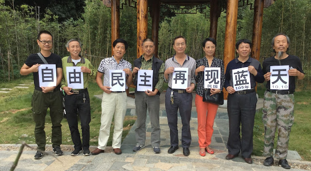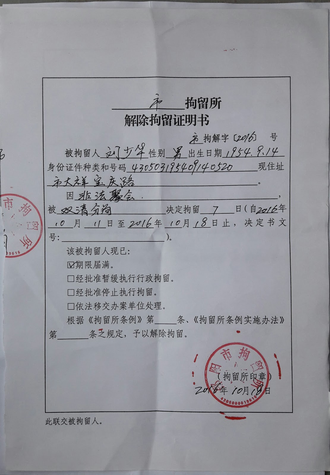 从左至右:谢周、李赞民、刘少华、陈玉华、尹正安、李旺玲、杨盛、朱承志;其中刘少华、陈玉华、朱承志三人被邵阳市公安拘留七天,三人已起诉邵阳市公安局双清分局违法拘留案。但是邵阳市双清区法院和邵阳市大祥区法院都不受理