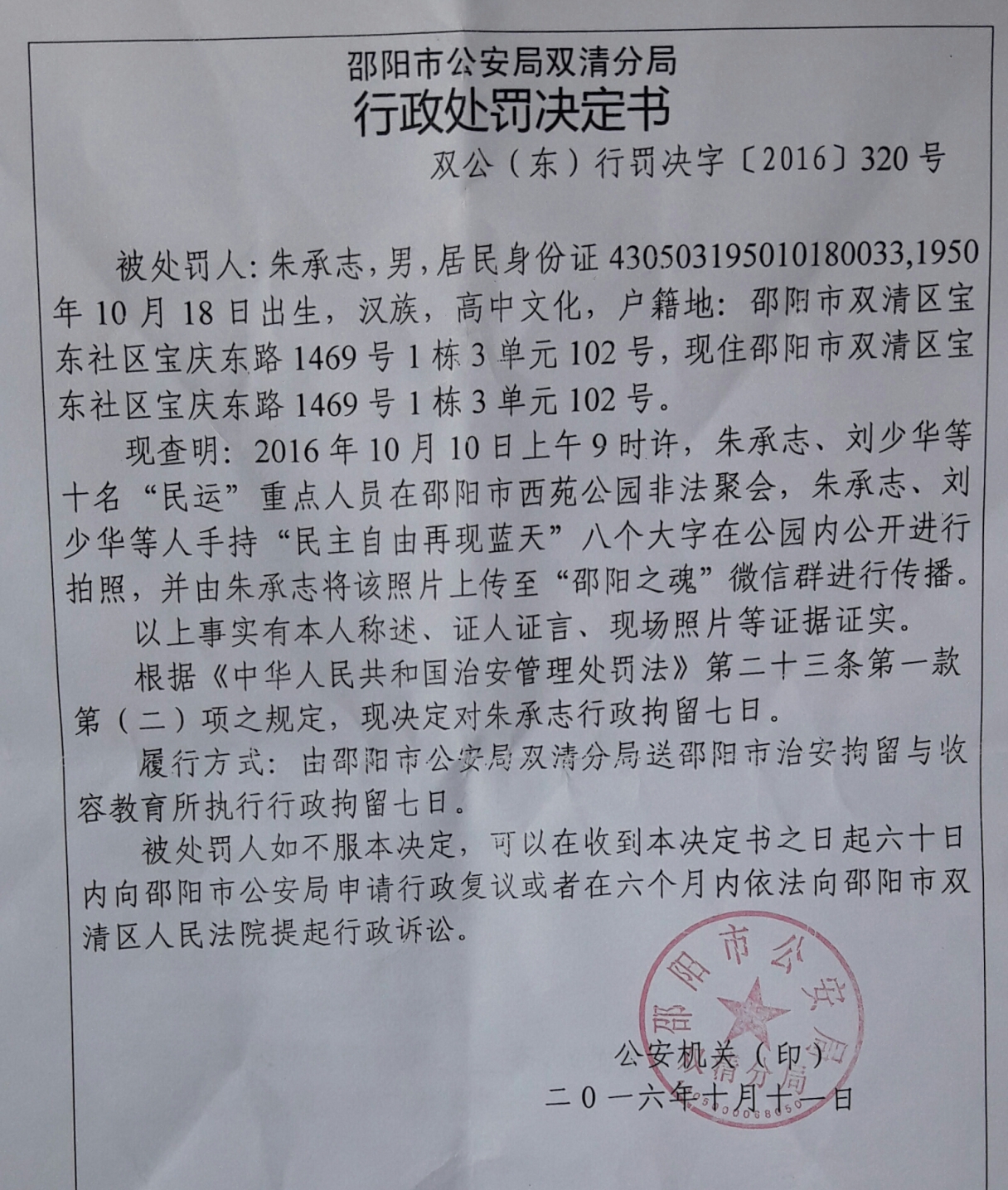 2016年10月10日上午9时许,朱承志、刘少华等十名公民在邵阳市西苑公园聚会,朱承志、刘少华等人手持“民主自由再现蓝天”八个大字在公园内公开进行拍照,并由朱承志将该照片上传至“邵阳之魂”微信群进行传播.在2016年10月10日、11日,刘少华、陈玉华、朱承志三人被邵阳市公安局双清分局分别行政拘留七日.