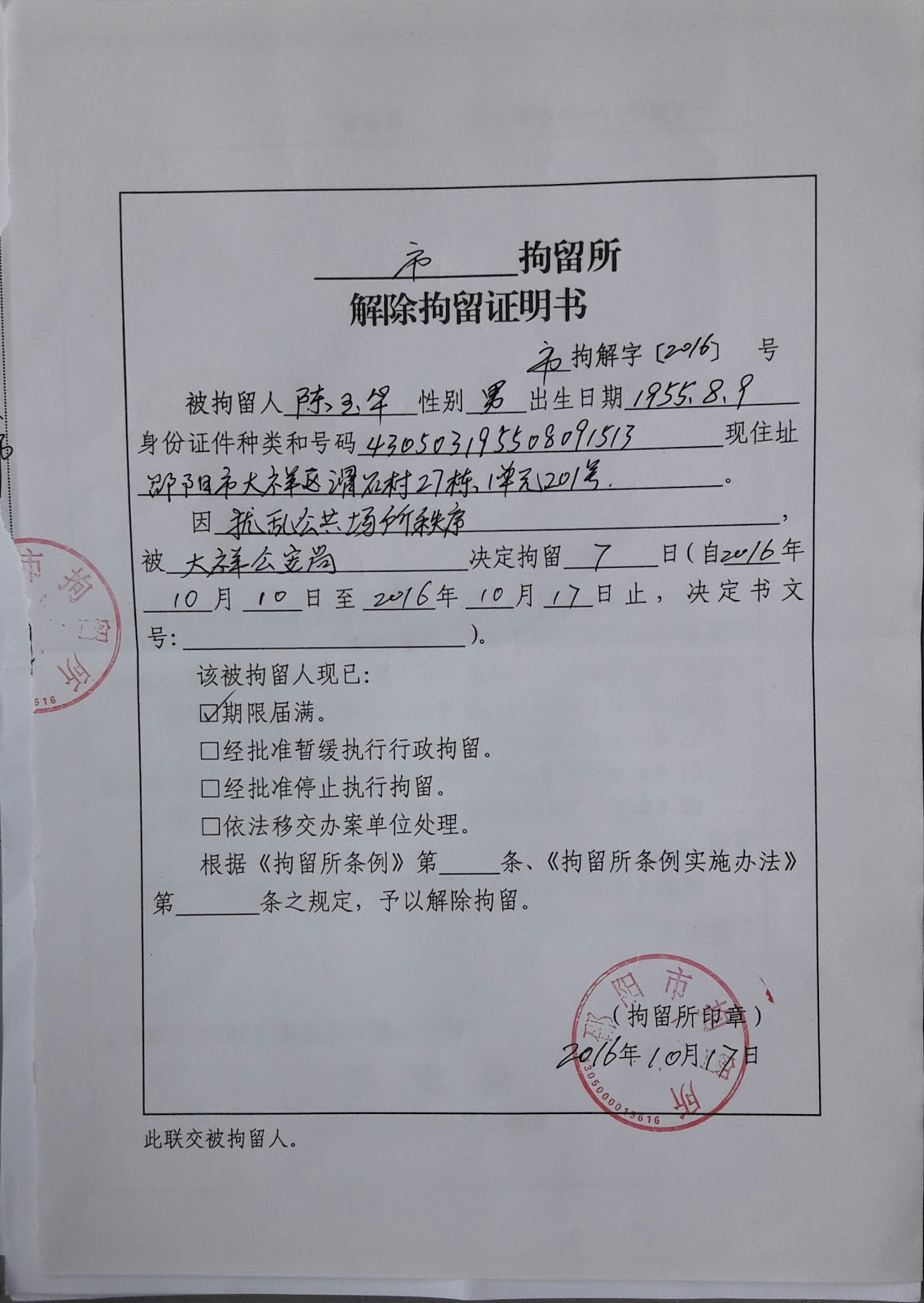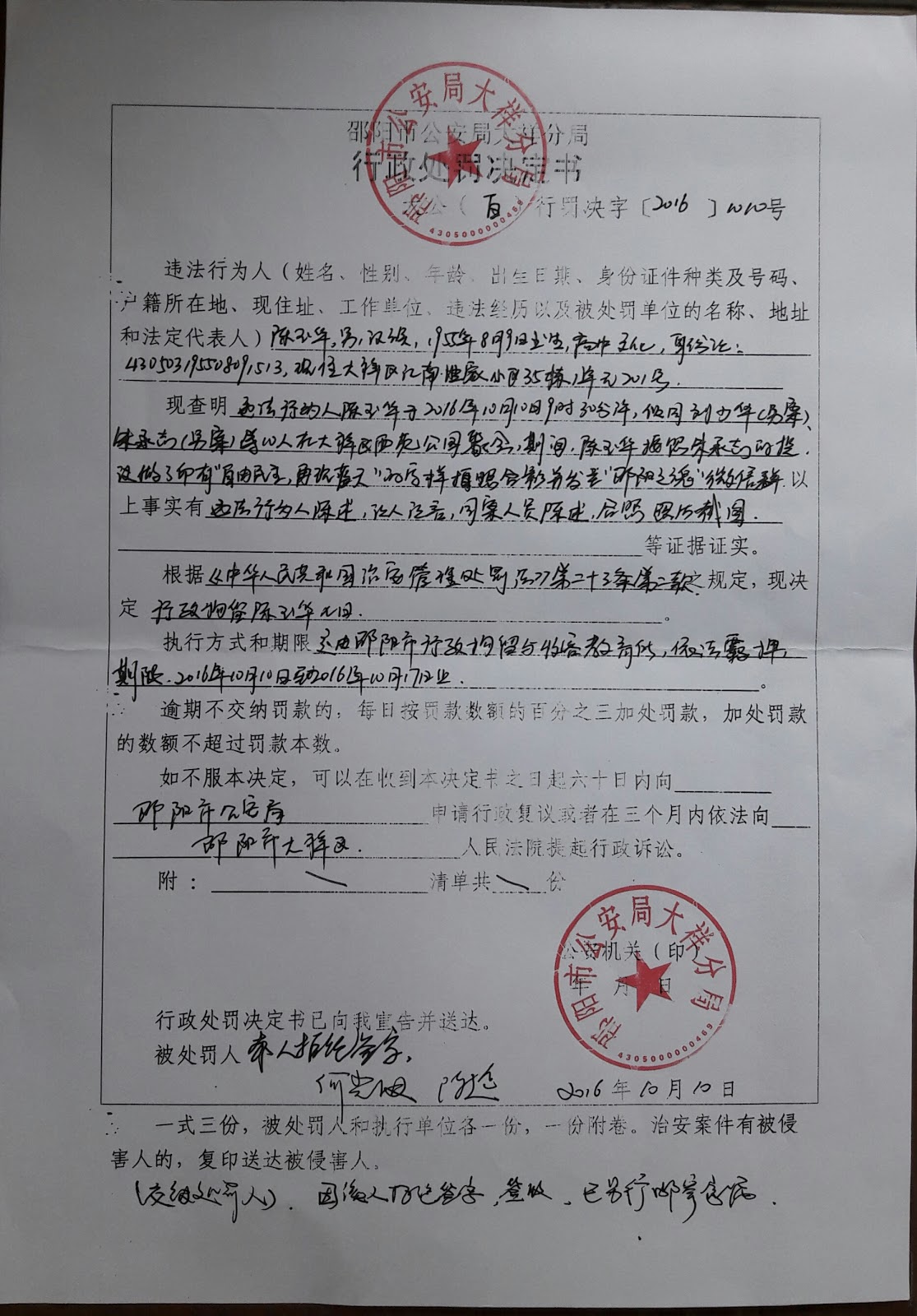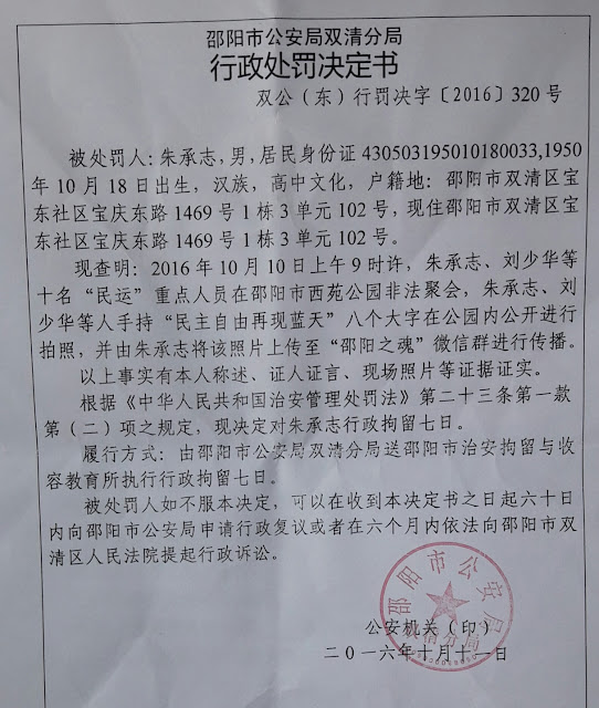 行 政 起 诉 状 原告:陈玉华,男,汉族,1955年8月9日出生,高中文化,身份证:430503195508091513,现住大祥区江南世家小区35栋1单元201号。电话号码:13907390055。 被告:邵阳市公安局大祥分局 诉讼请求: 1、请求贵院判决确认被告以我参加非法聚会并按照朱承志的提议做了印有“自由民主,再现蓝天”的字样拍照合影并发到“邵阳之魂”微信群,进行传播为由对我实施行政拘留七天的行为违反宪法。 2、请求贵院判决撤销大公(百)行罚决字【2016】1010号行政处罚决定书。 3、请求贵院判决被告赔偿我1696.1元(242.3元/天*7天=1696.1元)。 4、请求贵院判决被告承担诉讼费用。 事实和理由: 陈玉华于2016年10月10号9时30分许,协同刘少华(另案)朱承志(另案)等10人在大祥区西苑公园聚会,期间陈玉华按照朱承志的提议做了印有“自由民主,再现蓝天”的字样拍照合影并发到“邵阳之魂”微信群,这就是被告查明并对我予以行政拘留七天的事实。我全部认可该事实,但我认为我实施的行为全部符合宪法规定,被告对我实施处罚的行为违反了宪法的规定。被告以《中华人民共和国治安管理处罚法》第二十三条作为处罚我的具体理由因违反宪法第2、5、27、33、35、37和宪法序言的规定,确属违宪,应予撤销。现请求贵院依据《行政诉讼法》第70条的规定予以撤销大公(百)行罚决字【2016】1010号行政处罚决定书;依据第74条的规定确认被告对我实施行政拘留七天的行为违反宪法;依据《国家赔偿法》第3条、9条、33条的规定赔偿拘留我七天的赔偿金共计1696.1元,请依法予以判决。