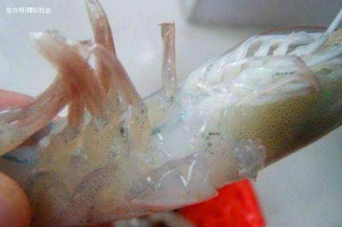 拨开虾头,里面有一种半透明果冻样的物体,像胶水一样。这到底是什么东西呢?于是李大婶便把照片拍了下来上传到网上问网友。