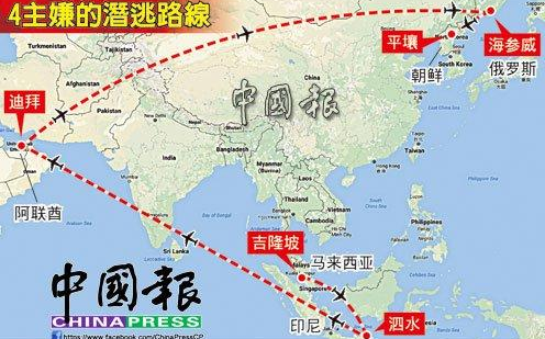 马国媒体引述警方消息说,四名主嫌是在监督两名落网女嫌犯干案后便进入离境室,接着搭机离开马国。他们先从吉隆坡飞往印度尼西亚雅加达(约1184公里),再从雅加达飞阿联酋的迪拜(约6579公里),接着从迪拜前往俄罗斯海参崴(约7085公里),最后才从海参崴飞回平壤(约686公里)。