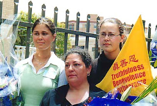 Three Falun Gong practitioners from Sydney who participated in the protest at Tiananmen Sqaure,Kate Douglass , Myrna Mack and Kay Belonogoff Rubacek, at the press conference in front of the Chinese Consulate in Sydney on November 22, 2001