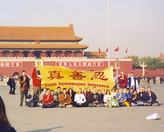 這個驚天動地的大歷史事件是,2001年11月20日,36名來自15個國家的西人法輪功學員齊刷刷的突然同時出現在天安門廣場,展開一個寫有「真善忍」的大條幅,爲法輪功請願。