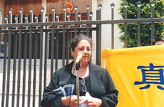 Jennifer Zeng talks about her experiences in Beijing Female Labour Camp in front of the Chinese Consulate in Sydney on November 22, 2001