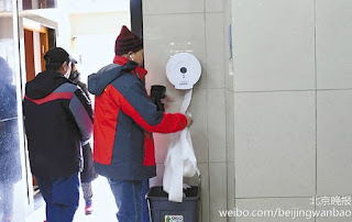 A Chinese man taking toilet paper from a public restroom in Beijing.