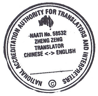 曾錚的翻譯章。翻譯件經我簽字蓋章後,能得到澳洲政府的承認,用作法庭證據等。有人是以這個爲職業的。我只是「玩票」的。