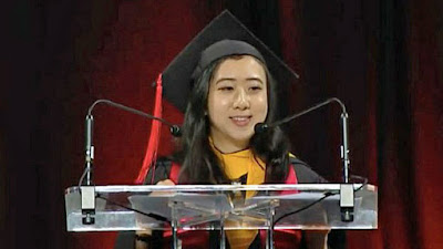 Basically, she praised the fresh air in the United States, contrasting it with the poor air quality in China. She made a similar comparison with freedom of speech in the academic community. She said she had never dreamed it was possible to openly discuss issues such as racism, sexism, and politics, as in China “only authorities owned the narrative.” Her speech received warm applause.