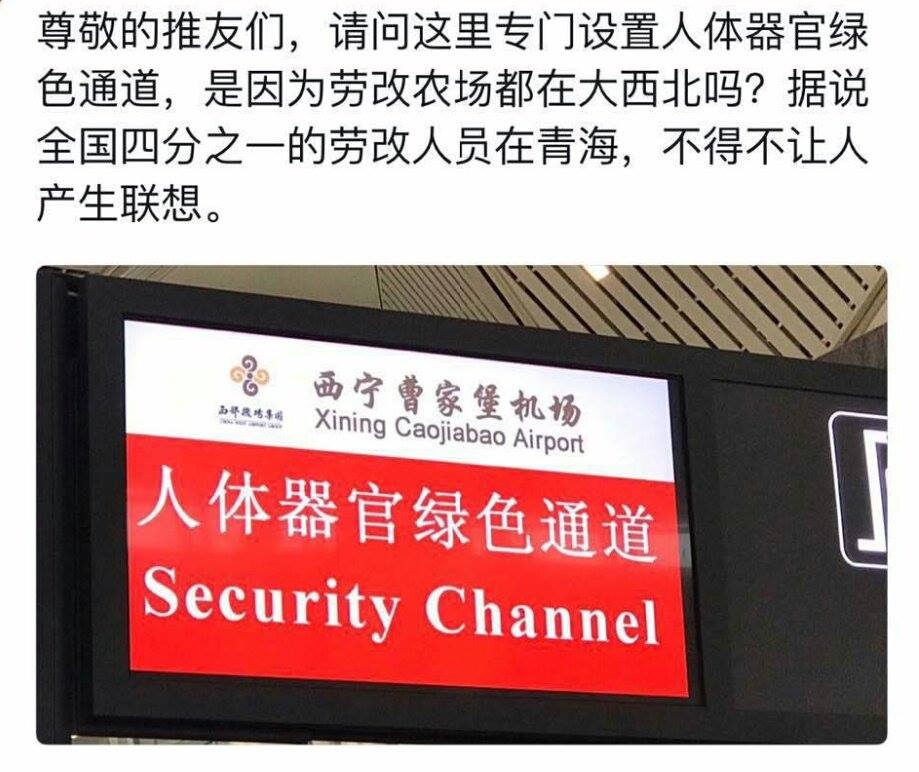 After I shared the photo of a sign at Xining Caojiabao Airport in Xining, capital of Qinghai Province, China, which says "fast track channel for human organs" in Chinese yesterday, somebody left a comment by saying that he had been to Qinghai recently, and that he had not seen such a channel.