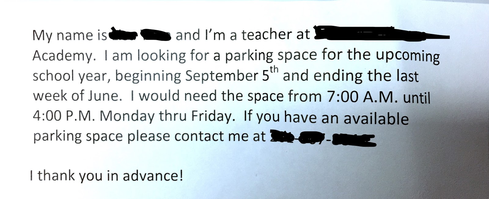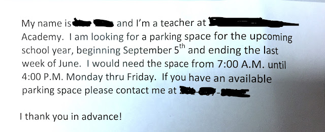 A note found in my mail box, seeking for a parking space. 這張尋車位小紙條,是在我信箱裏發現的。