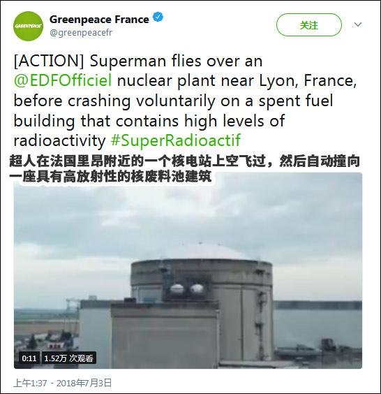 “超人在法国里昂附近的一个核电站上空飞过,然后自动撞向一座具有高放射性的核废料池建筑”,绿色和平组织在官方推特中写道。
