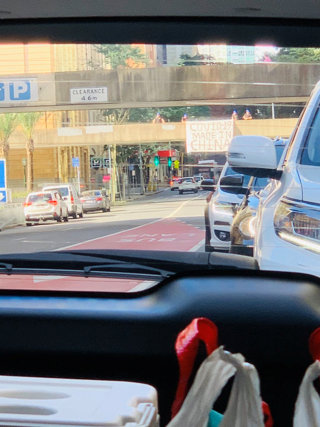 澳布里斯班CBD挂出巨幅标语,过往车辆不断,无人制止