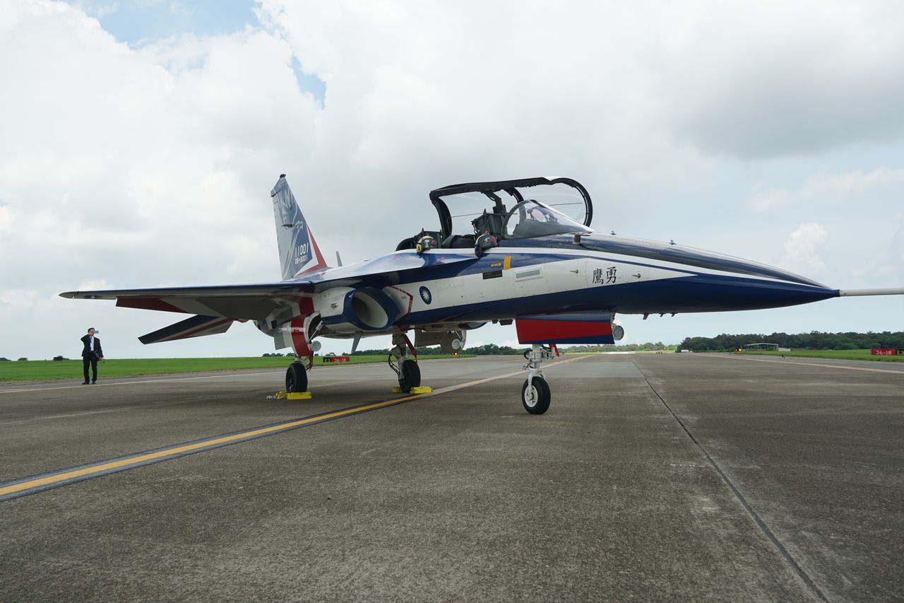 勇鹰高教机。(林仕祥/) 被蔡英文政府视为国机国造政策的里程碑——“勇鹰”首次升高共飞行12分钟,飞行科目包括地面滑行、高速滚行升空、空中飞行测试、五边进场、保持最佳进场姿态落地等等,并由IDF经国号战机伴飞;“勇鹰”成功落地后,伴飞的IDF高速冲场通过观礼台,向“勇鹰”道贺,象征台湾国机国造代代传承。