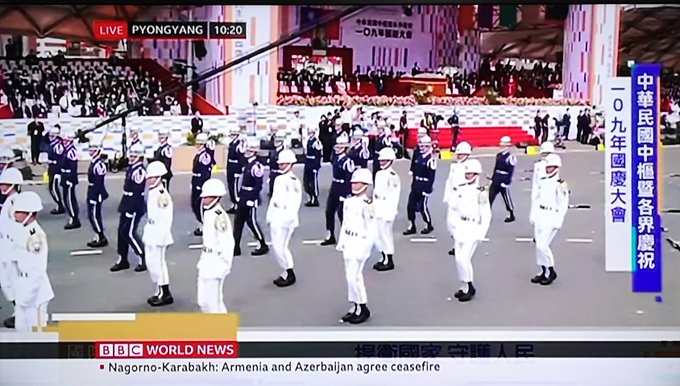 须藤玲司的贴文还附上多张BBC画面截图,可以看到国军游行,现场到处都是青天白日满地红国旗,但报导画面却用英文将地点标示为平壤。 须藤在推文质疑,BBC应该要放平壤的直播影像,“但这画面对吗?” 须藤后来还说,30分钟过后,BBC已对误植影像致歉并更正。