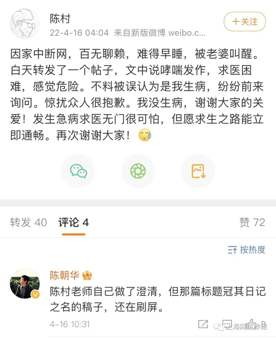 一早醒来,全网都在传阅一篇署名(上海市作家协会副主席)陈村的文章,题为:《惊心动魄,昨晚差点死于封控》。