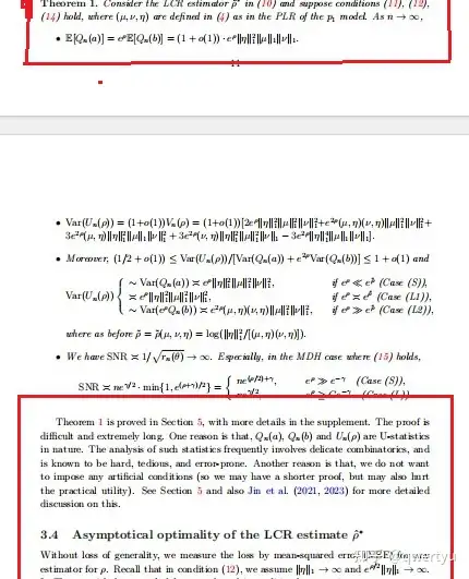 田野思维混乱,智力低下,用估计-假设当作证据:定理1. 考虑式(10)中的LCR估计量ρ̂*, 假设条件...。当n→∞时,........。 定理1在第5节中证明,更多细节见补充材料。证明过程复杂且冗长,原因有二: 其一,....本质上是U统计量,此类统计量的分析常涉及精细组合数学,已知过程复杂、繁琐且易出错; 其二,我们不强加任何人为条件(虽可缩短证明,但可能降低实用性)。3.4 LCR 估计 ρˆ *的渐近最优性 为避免讨论的普遍性,我们采用均方误差(MSE)作为 ρ 估计量的性能度量。回顾条件(12)时, 我们假设∥ η ∥1→∞且e ρ /2∥ η ∥1→∞。在下文定理2中, 我们通过假设进一步强化了这一条件。 田野证明使用预期理由的错误定理5.(正态性)。 假设条件(11)-(14)成立。当n → ∞时,.....。 我们必须对SNR有一个一致的估计,或者.....。 有一个一致的估计。根据定理1,.....。 现在我们讨论如何估计Vn(ρ)。首先,我们可以用ˆρ估计ρ。其次,我们可以分别用A11 ij和A10 ij估计Ω11 ij和Ω10 ij。 最后,根据稀疏性假设(11),可以看出.....。因此,我们可以通过 ....。分别估算rij、sij和tij