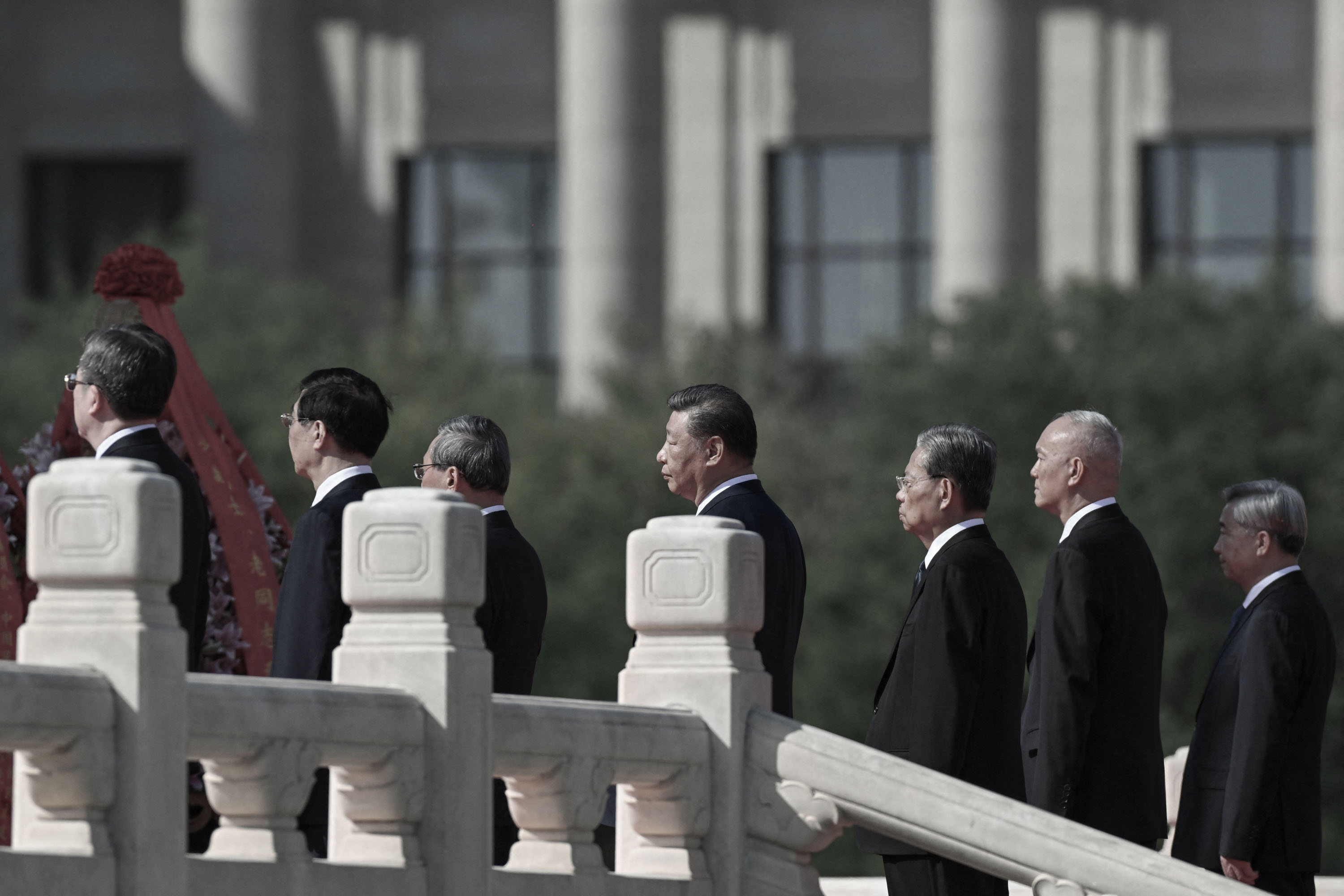 四中全会并非像公报那样风平浪静。 参加四中全会的中央委员168人,比参加三中全会的199人少了31人,超过15%的中央委员没有现身。有14名中央委员已经落马,包括何卫东等人,其他没有参加会议的中央委员,或者不愿参加这场毫无意义的演出,或者是参加不了。 参加四中全会的中央候补委员147人,比参加三中全会的165人少了18人,其中4人已经落马。11个中央候补委员被增补为中央委员,一些本该按顺序递补的人被略过,要么已经出事了,要么仕途岌岌可危,他们估计也无法在四中全会上现身。 2025年9月30日,中共政治局七常委在北京天安门广场参加向纪念碑献花圈活动。(Greg Baker/AFP via Getty Images)“僵局”难破?四中全会公报照样套话连篇,极力掩盖激烈的内斗,但中共国防部提前宣布的9名上将处理结果,早已打破了虚假的谐和。中共高层更迭没有发生,但23人的政治局没人递补,中共军委7人剩4人,也硬生生地摆着。