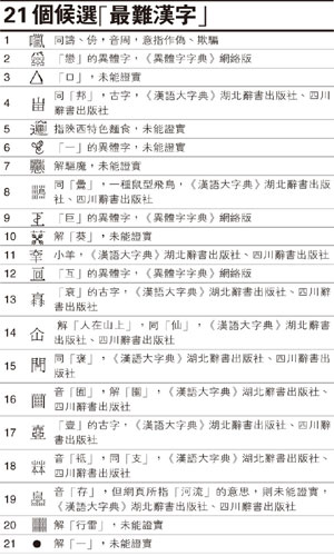 身为中国人,就应该懂中文字,你又认得几多个?有网民在网上搞“最难汉字”评选活动,选出21个一般人不认识的生字候选,个个令人摸不着头脑。