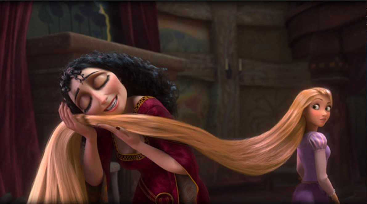 巫婆冒充长发公主的“妈妈”,把年幼的长发公主关在密林深处的高塔中养大。利用给长发公主梳头的机会吸取长发的神力,巫婆始终容光焕发。