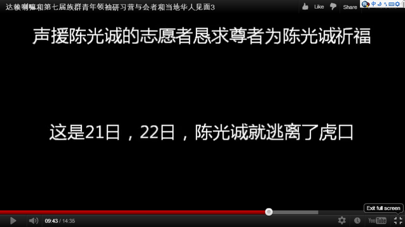 下面的视频是王雪臻在4月21日同达赖喇嘛见面会上要求达赖喇嘛为陈光诚祈福。