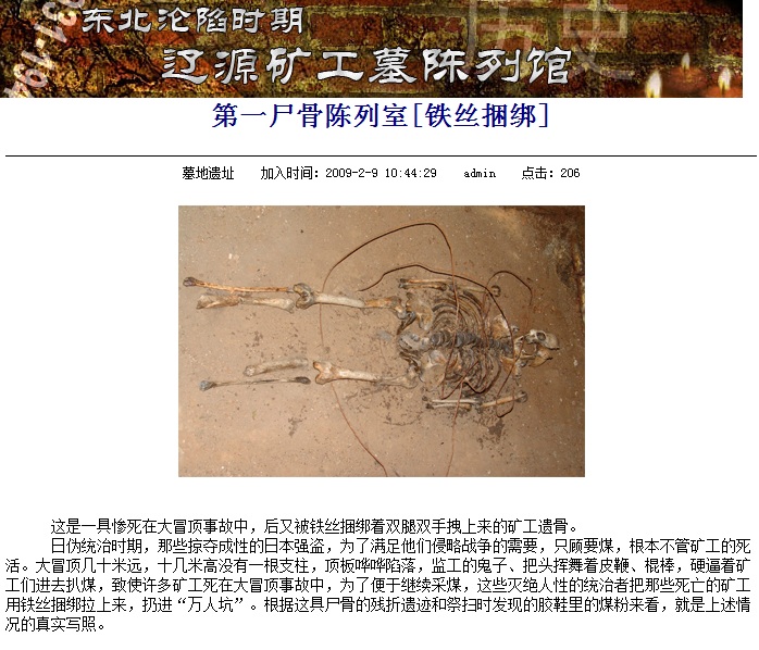 很显然,根据图片中的说明,这图片中的铁丝是摆拍的,这是一幅人为伪造的铁丝捆绑尸体的照片。但无论如何,这张图片证明,在日伪统治时期,一旦矿上发生事故,这日本鬼子还尽全力去救人捞尸体的,日本鬼子还知道用铁丝去打捞尸体,而不是坐等五六天,等到水落尸出之后,才去打捞尸体。如果是在日伪时期,相信宋伟叔叔也能得个全尸,而不是一个被泡肿胀的气球!