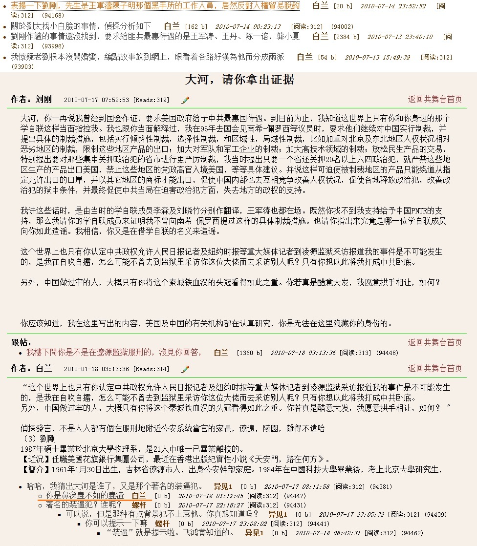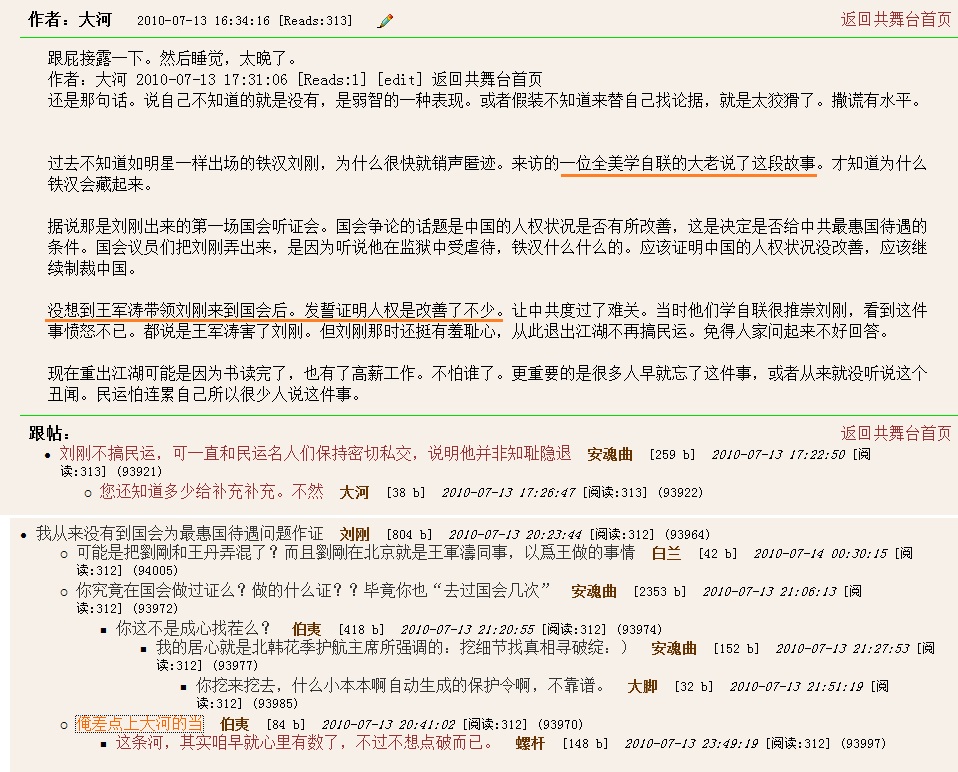 下面是魏京生以笔名“大河”对我进行的造谣贴。魏京生每年都要对我进行这同样的造谣。我曾当面对他解释过,可他继续以笔名在网上对我进行造谣。魏京生对我的造谣主要有下面几个: