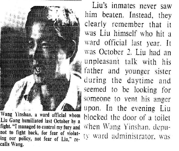 那是1993年,我被关押在凌源第二劳改队。因为我经常是通过各种方式向外界揭露中共政权侵犯人权,殴打政治犯,使得世界舆论特别关注我在凌源监狱中状况,方励之等人多次联合国人权大会上宣读我谴责中共政权的公开信。这迫使中共当局派御用记者去凌源监狱去采访我,以便作搞什么正确舆论导向,也就是搞欺骗性的宣传。中共政权派了来自《北京周报》、《人民日报》、《瞭望周刊》的四名记者去凌源监狱采访我,随后,他们就在中共在海外发行的各种英文报刊上发表了一大堆诽谤我的文章。上面贴出的图片,就是北京周报借用姜德宏的口对我造谣诽谤的内容。为了证明《北京周报》所讲的内容属实,北京周报还同时刊发了姜德宏本人穿囚服的照片。