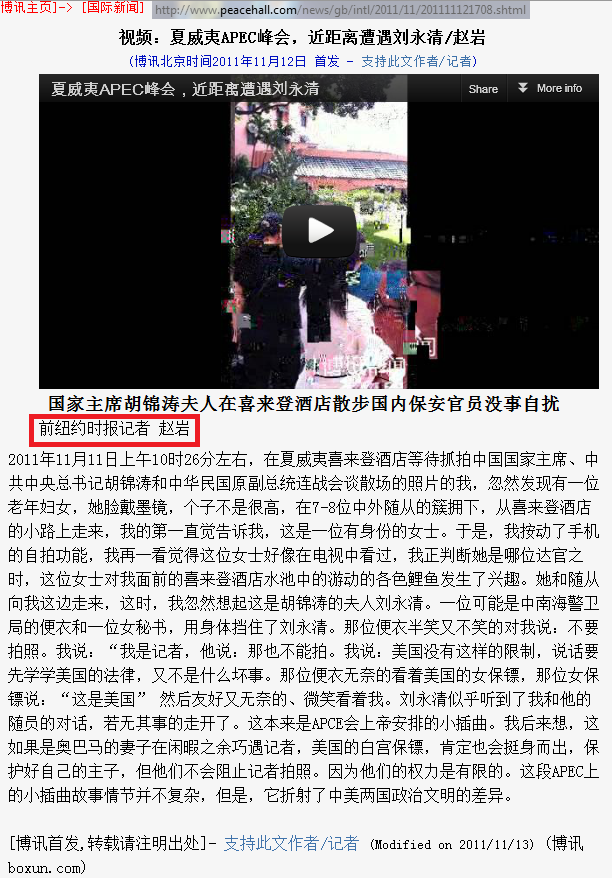 第一组证据:赵岩在《博讯》网站、《参与》网站发表大量署名是“前纽约时报记者/赵岩”的文章。为了防止赵岩继续狡辩,我将赵岩的一篇文章截屏如下。