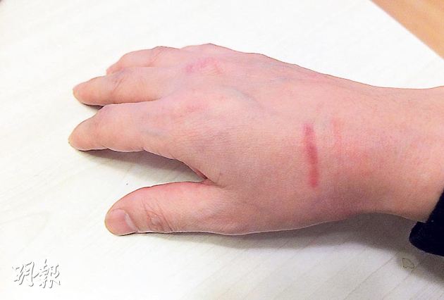 2012年11月28日,明报记者探访刘霞时,被监视刘霞的保安将手抓伤。