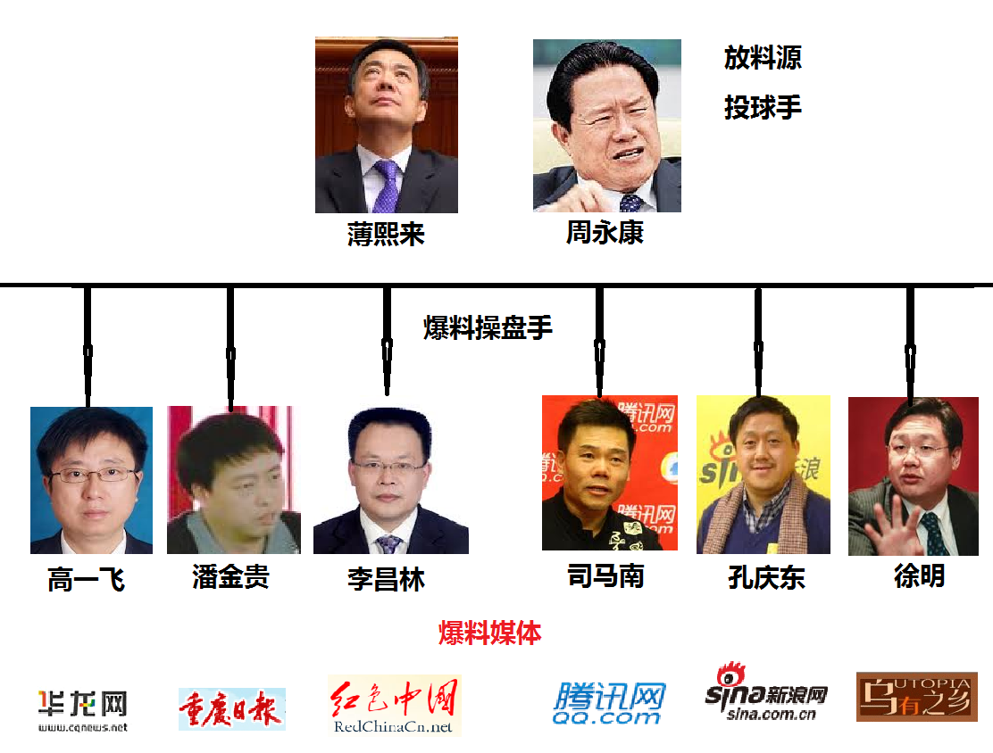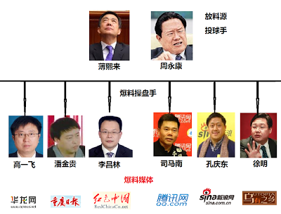 当然,目前中共内部各派已经斗得你死我活,各方都有自己的爆料网。下面的图片给出周永康和薄熙来的爆料网。