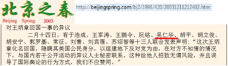 1998年2月,中国海外民运之父王炳章也是同样方式回国,被中共逮捕。可就在王炳章身陷囹圄之际,就有于浩成、王军涛、王鹏令、阮铭、吴仁华、胡平、胡立俊、胡安宁、郭罗基、常征、刘青、刘宾雁、苏绍智等十三人联合发表声明,对王炳章进行愤怒谴责。吴仁华也名列其中。当时,刘青和胡平利用所掌握的舆论工具《中国人权通信》及《北京之春》,连篇累牍地发文发声明谴责王炳章,将他们的谴责声明四处向民运人士发传真,让大家签名。我就收到了几份。这还不够,这十三大佬还要海外中文媒体刊登他们的声明,《世界日报》等华文媒体拒绝刊登十三大佬谴责王炳章的声明。这十三大佬居然花钱买广告,在《世界日报》的广告栏里刊登了他们谴责王炳章的声明,声明的题目就是《我们的愤怒和谴责》。下面的图片给出《北京之春》报道十三大佬谴责王炳章的新闻。