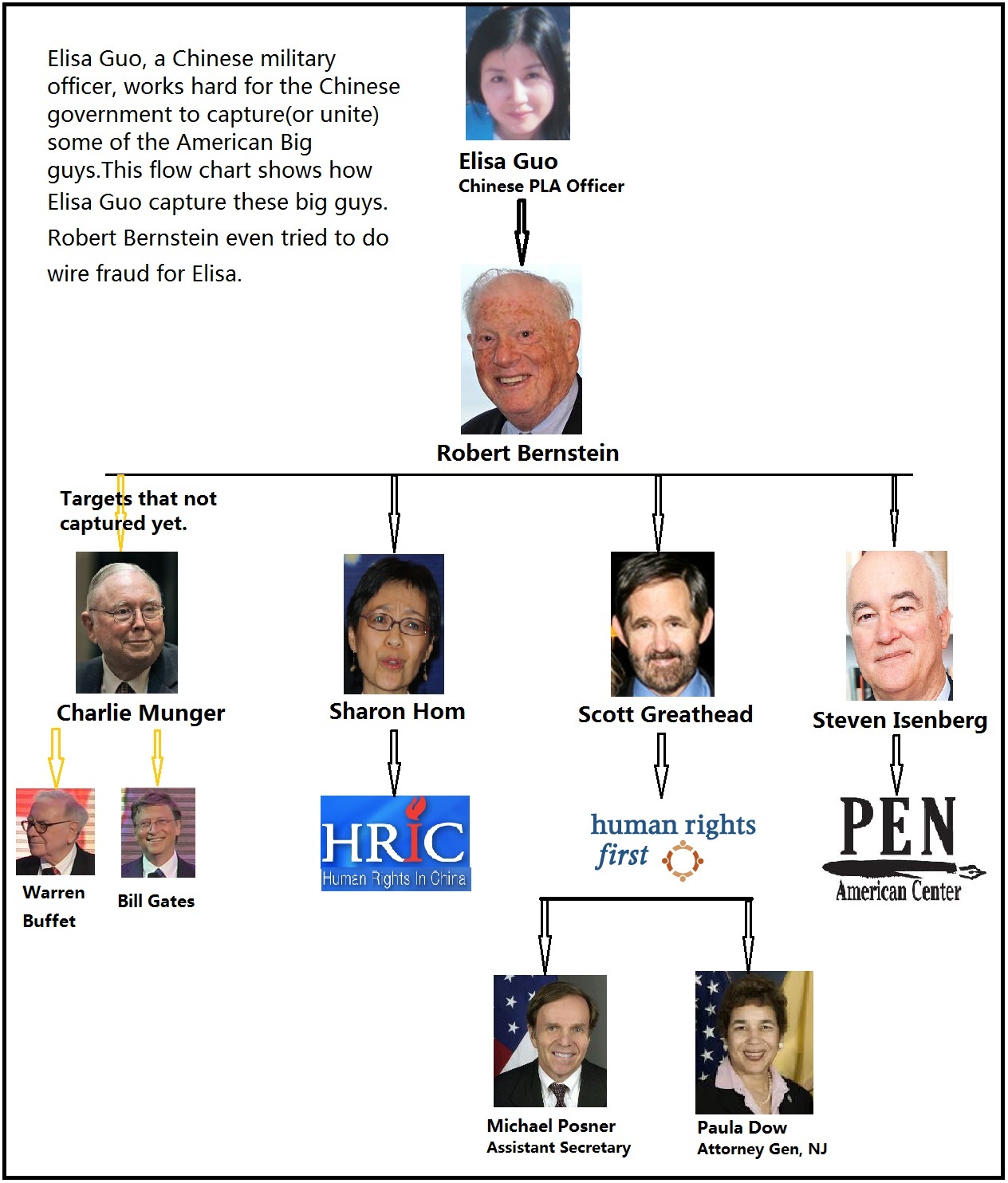 上面的图表简单地画出中共女军官郭盈华通过美人计在美国建构的关系网。郭盈华首先将伯恩斯坦拉下水,迫使伯恩斯坦向郭盈华提供大量美国秘密情报,并通过伯恩斯坦将美国笔会主席伊森博格和中国人权主席谭竞嫦拉下水。郭盈华的手段很简单,就是让伯恩斯坦及其手下进行电汇欺诈活动,掌握了伯恩斯坦等人违法犯罪证据,随后就裹挟这些美国大腕为中共服务。通过这种方式,郭盈华还要挟美国助理国务卿波斯纳,以及新泽西总检察长泡拉-道为其提供服务,参与对我的司法迫害。