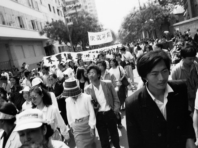 这是学生游行的队伍。可以看到标语上的口号是“拥护共产党”“振兴中华”等。那时的游行常有一种狂欢气氛,很少有人料到后面的血腥。