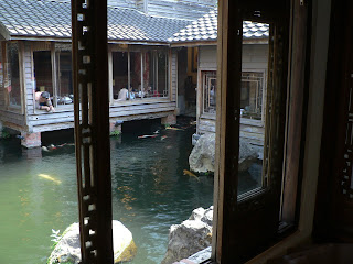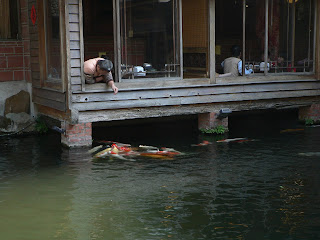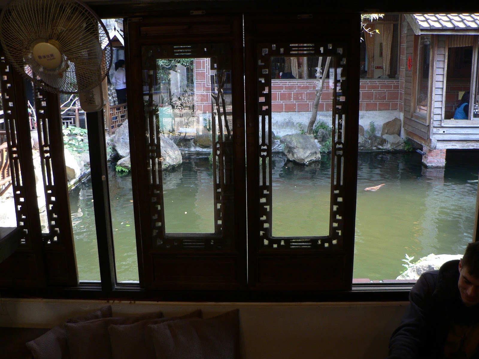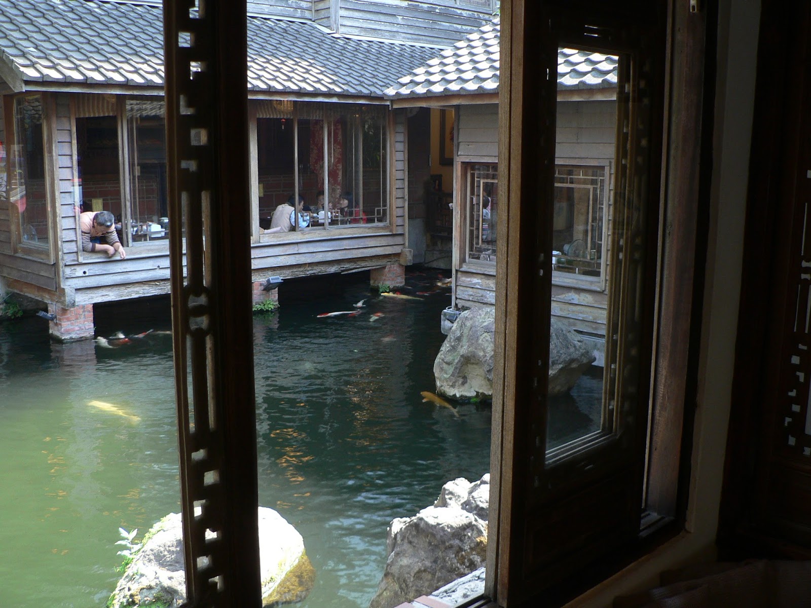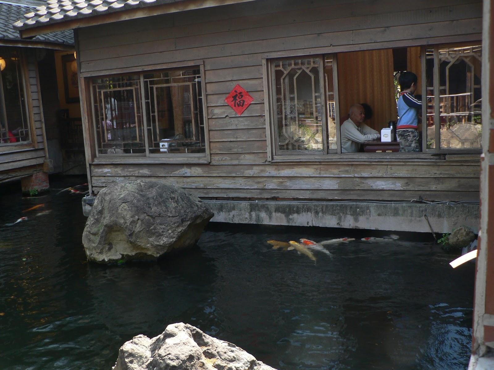 餐館的不同包間之間,有一個養了很多金魚的池塘。坐在日式的“塌塌米”上,倚在窗邊看“對岸”的食客喂魚,好不愜意。