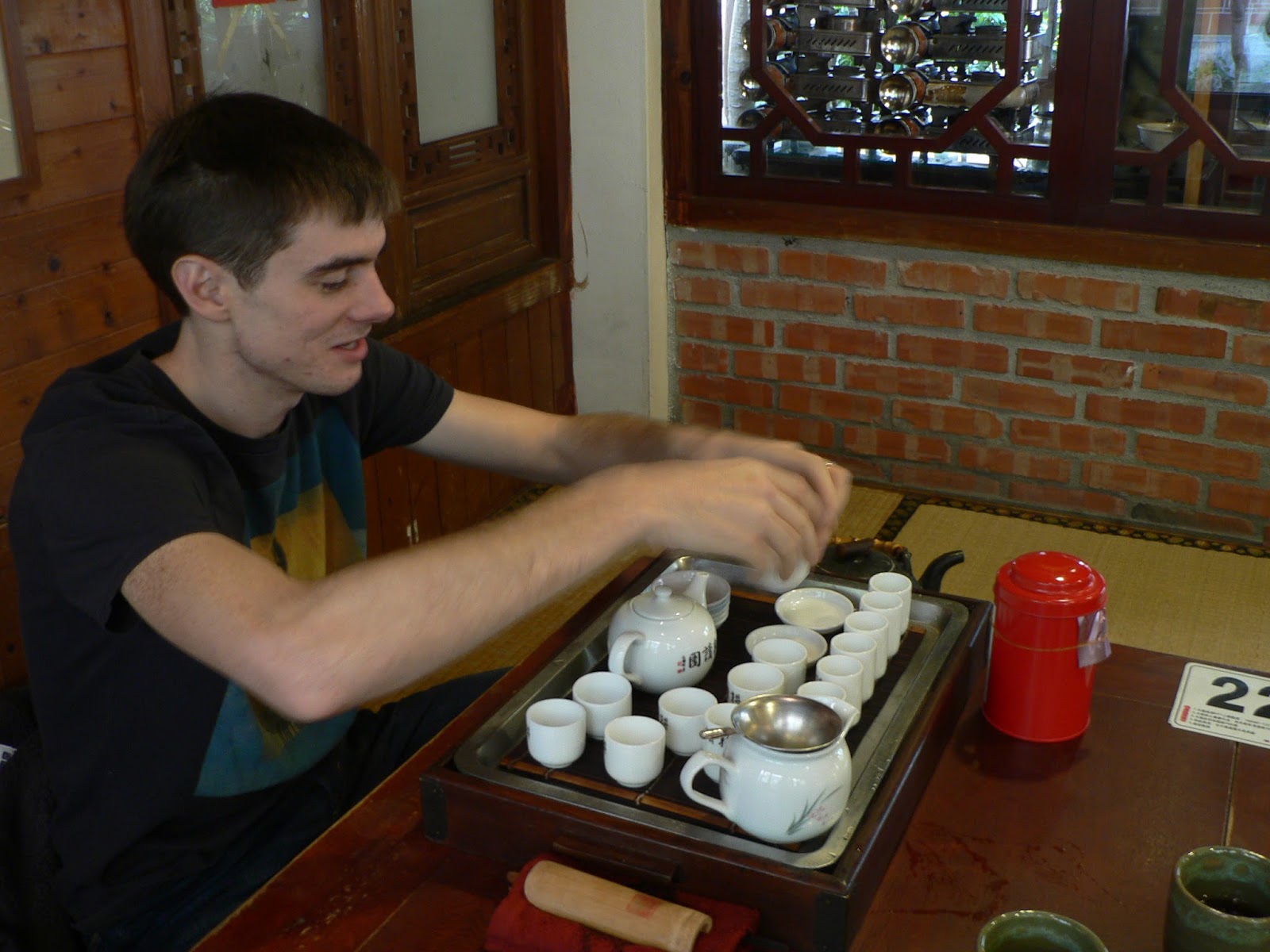 茶來了,我們之間,最懂得如何泡茶的,竟然是“老外” 郝毅博。他專門研究過茶道,於是很專業的操作起來,其他人只敢看著。