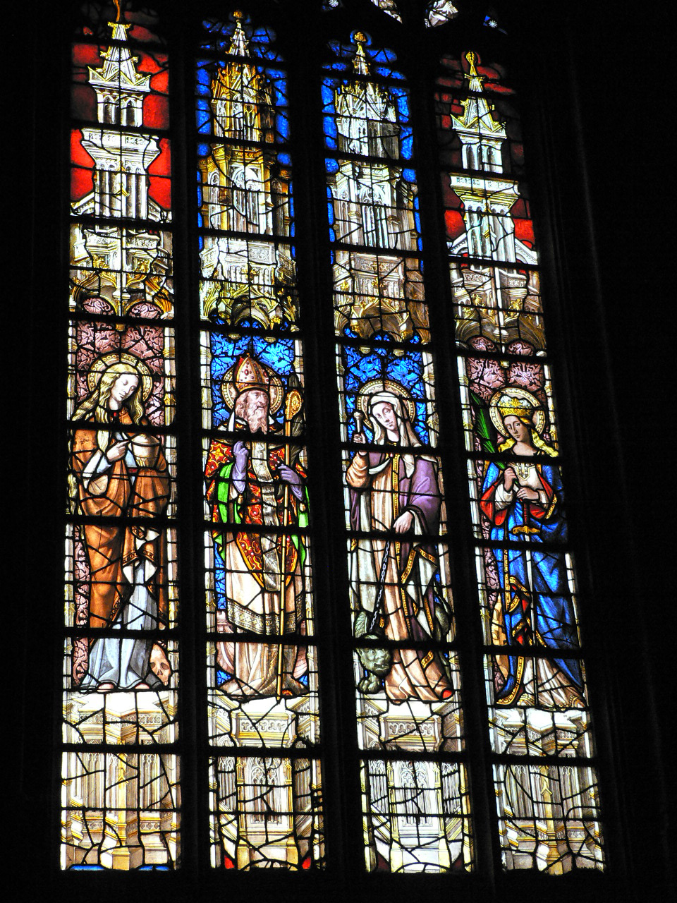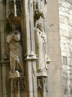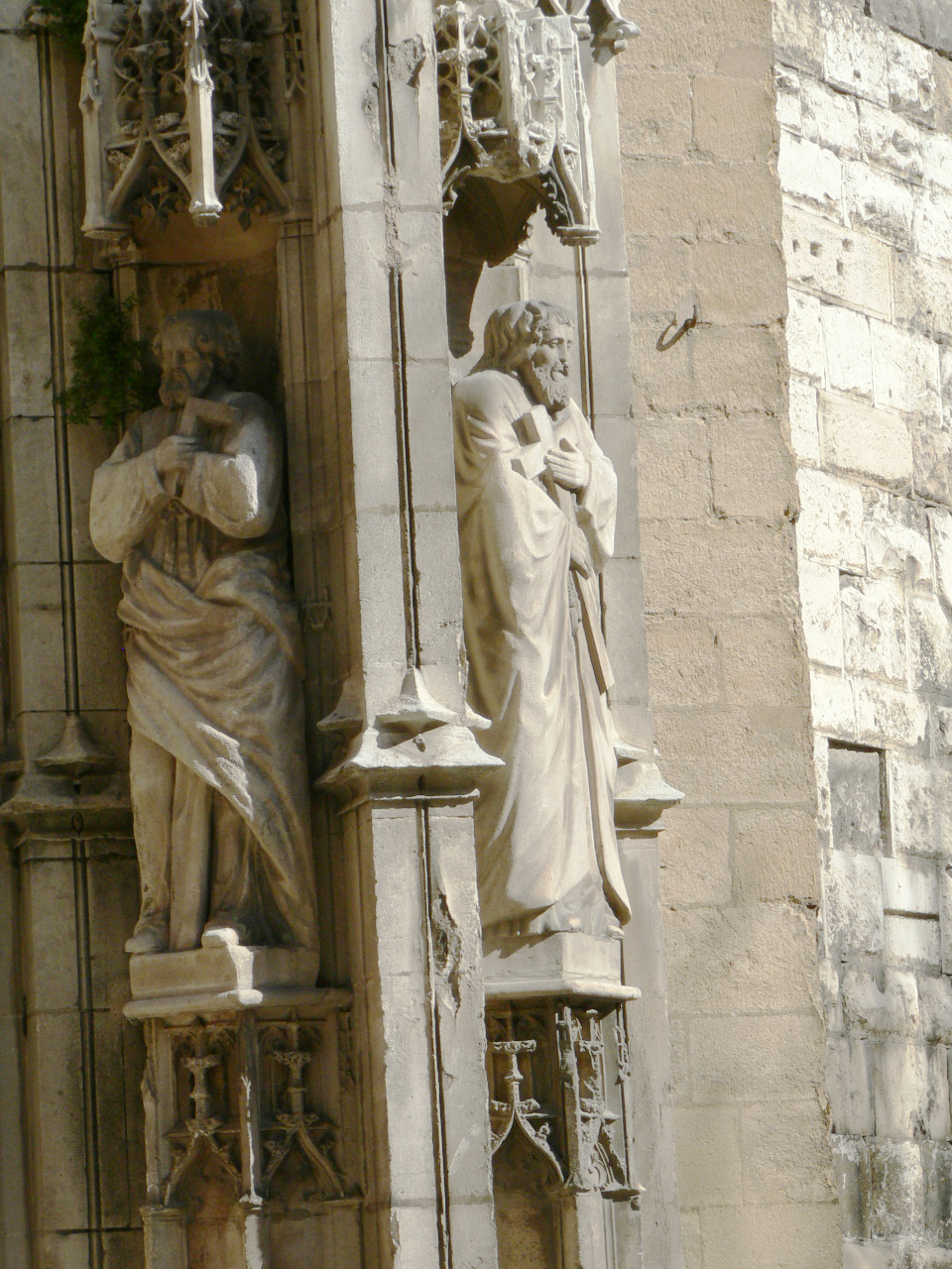 教堂正门上的各种精细雕像。红色的是核桃木门。